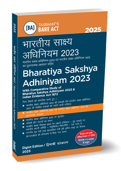 This comprehensive legal resource focuses on the bare text of the Bharatiya Sakshya Adhiniyam (BSA) 2023, offering a detailed comparison with the Indian Evidence Act of 1872. By providing side-by-side text in both Hindi and English, this book effectively breaks down language barriers, making the nuances of the law accessible to all. The inclusion of tables, indexes, and comparative studies further enhances the reader's ability to understand and relate the new legislation to the historical Indian Evidence Act.