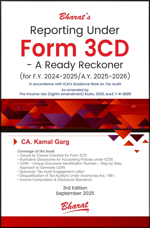 Chapter 1 Tax Audit – An Introduction Chapter 2 Form 3CA and Form 3CB – An Analysis Chapter 3 Form 3CD — Ready Reckoner Chapter 4 Draft Disclosure Requirements for Clause 13(f) of Form 3CD Chapter 5 Tax Audit Engagement Letter Chapter 6 Income Computation & Disclosure Standards A. Income Computation and Disclosure Standard I relating to accounting policies B. Income Computation and Disclosure Standard II relating to valuation of inventories C. Income Computation and Disclosure Standard III relating to construction contracts D. Income Computation and Disclosure Standard IV relating to revenue recognition E. Income Computation and Disclosure Standard V relating to tangible fixed assets F. Income Computation and Disclosure Standard VI relating to the effects of changes in foreign exchange rates G. Income Computation and Disclosure Standard VII relating to government grants H. Income Computation and Disclosure Standard VIII relating to securities I. Income Computation and Disclosure Standard IX relating to borrowing costs J. Income Computation and Disclosure Standard X relating to provisions, contingent liabilities and contingent assets Circular No. 10/2017, dated 23-3-2017: Clarifications on Income Computation and Disclosure Standards (ICDS) notified under section 145(2) of the Income-tax Act, 1961 Chapter 7 Income Computation and Disclosure Standards vis-à-vis Judicial Precedents Chapter 8 ICDS (Revised) v AS Chapter 9 ICDS (Revised) v Ind AS Annexure 1 Audit report under section 44AB of the Income-tax Act, 1961, in a case where the accounts of the business or profession of a person have been audited under any other law Annexure 2 Audit report under section 44AB of the Income-tax Act, 1961, in the case of a person referred to in clause (b) of sub-rule (1) of rule 6G Annexure 3 Statement of particulars required to be furnished under section 44AB of the Income-tax Act, 1961  |