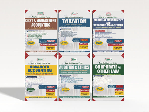 This Practical Learning Series – 6 Book Combo Pack is meticulously designed for CA Intermediate students under the New Syllabus. Authored by renowned faculty members CA G. Sekar and CA B. Saravana Prasath, the set covers all major subjects with a perfect blend of conceptual clarity, practical application, and examination-oriented approach. Fully updated with the latest amendments, case studies, and practice questions, it ensures a comprehensive preparation for upcoming CA Intermediate examinations.