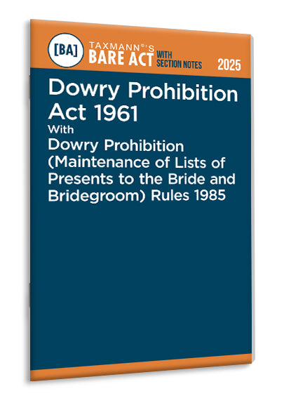 Dowry Prohibition Act 1961 with Dowry Prohibition (Maintenance of Lists of Presents to the Bride and Bridegroom) Rules 1985 [Bare Act with Section Notes] by Taxmann is an authoritative legal text that consolidates and clarifies the laws governing the prohibition of dowry in India. This edition presents the principal Act, subsequent amendments, the relevant Rules, and detailed section-by-section notes. It aims to provide a clear, comprehensive guide to understanding and applying the provisions related to dowry prohibition and maintaining lists of presents exchanged during marriage ceremonies.
