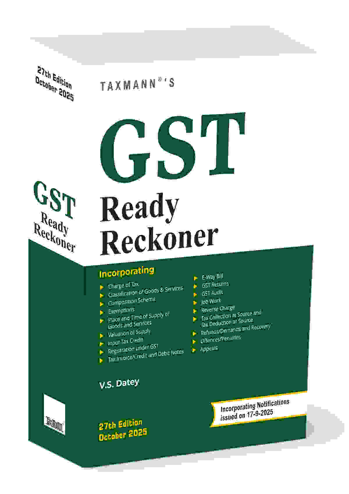 GST Ready Reckoner is a single-volume, practice-oriented digest that consolidates the law, rules, and procedures of India's Goods & Services Tax (GST) in a logically sequenced and quick-referencing format. Aligned to notifications up to 17-09-2025, this Edition helps professionals interpret core charging provisions, apply place/time/value rules correctly, compute and utilise ITC, comply with invoicing/returns/e-way bill mandates, and navigate assessments, audits, demands, refunds, offences, and appeals with precision. The book also covers sector-specific applications (real estate, construction, transport, finance, telecom, e-commerce, government activities, etc.), ensuring readers can resolve day-to-day issues and prepare for litigation with clear paragraph-by-paragraph guidance.